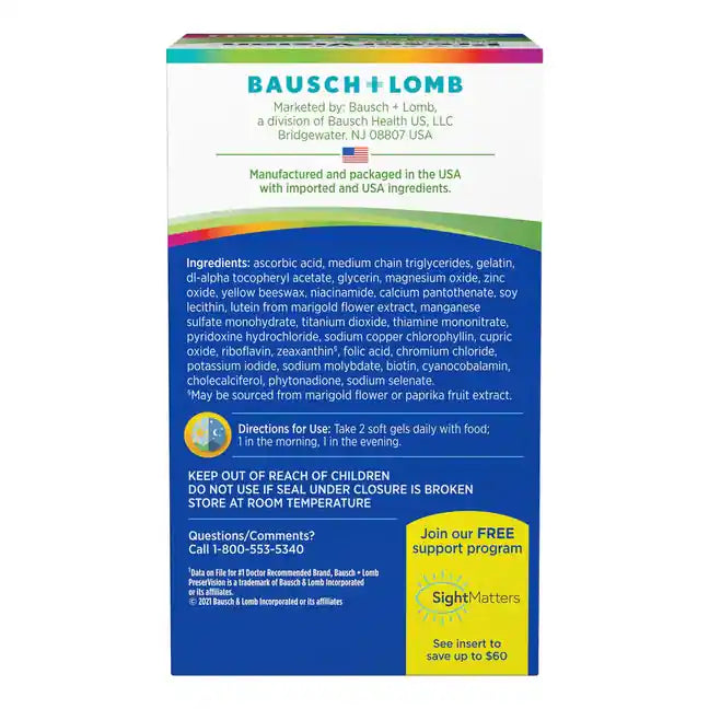 "PreserVision AREDS2 ofrece una combinación científica de vitaminas y antioxidantes que protegen tus ojos, reducir el riesgo de degeneración macular. Fortalecer la retina con luteína y zeaxantina, reponer nutrientes perdidos por la edad o el estilo de vida. En un mundo digital, tus ojos están expuestos a pantallas, luz azul y oxidación.