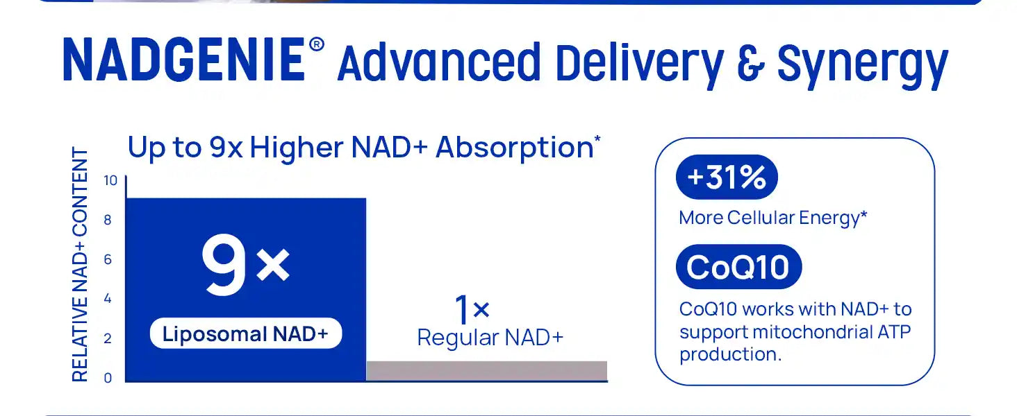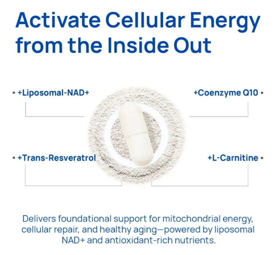 ⚡ Energía celular regenerada: NAD+ (Nicotinamida Adenina Dinucleótido) liposomal apoya la producción de energía mitocondrial, combatiendo la fatiga y revitalizando a nivel celular.