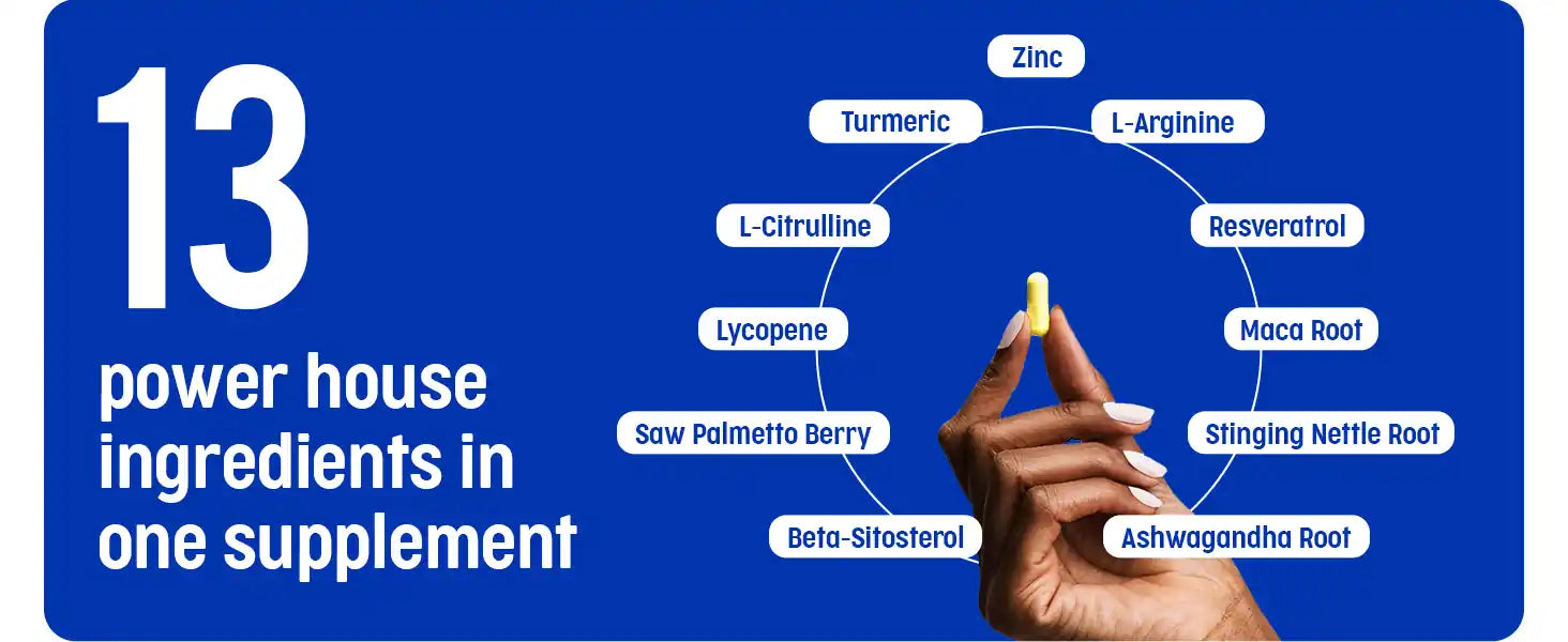 NAD+, Resveratrol, CoQ10, L-Carnitine, L-Arginine, L-Citrulline, Zinc, Ashwagandha, Maca, Saw Palmetto, Stinging Nettle, Beta-Sitosterol, Lycopene